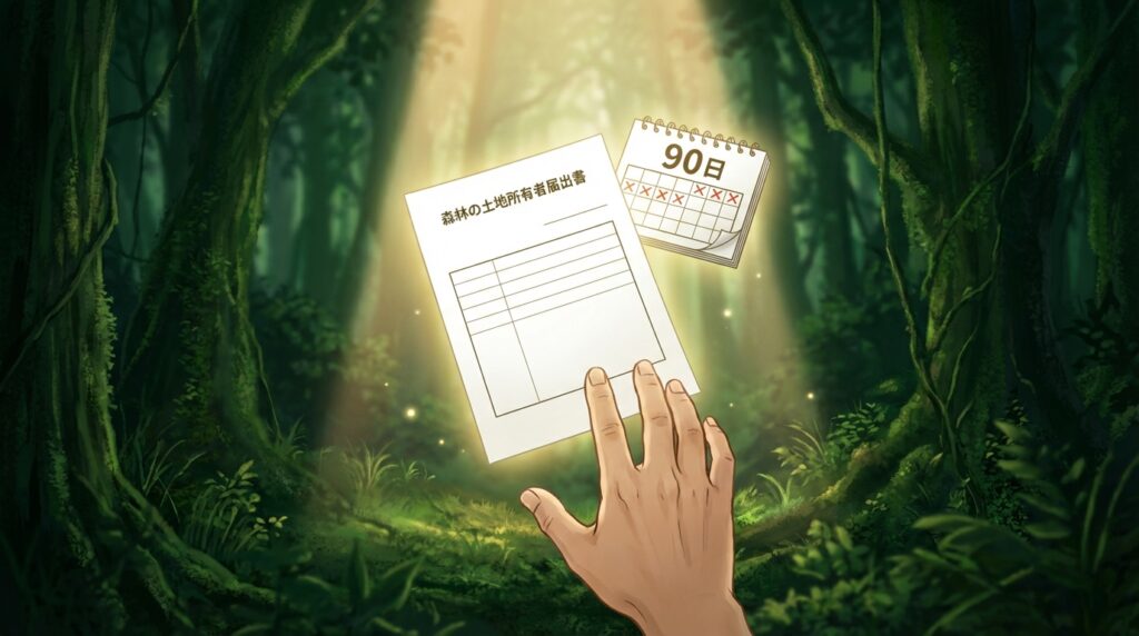 実は、相続などで山林の所有者になった場合、所有者となった日から90日以内に「森林の土地の所有者届出書」を提出するという大切なルールがあります。