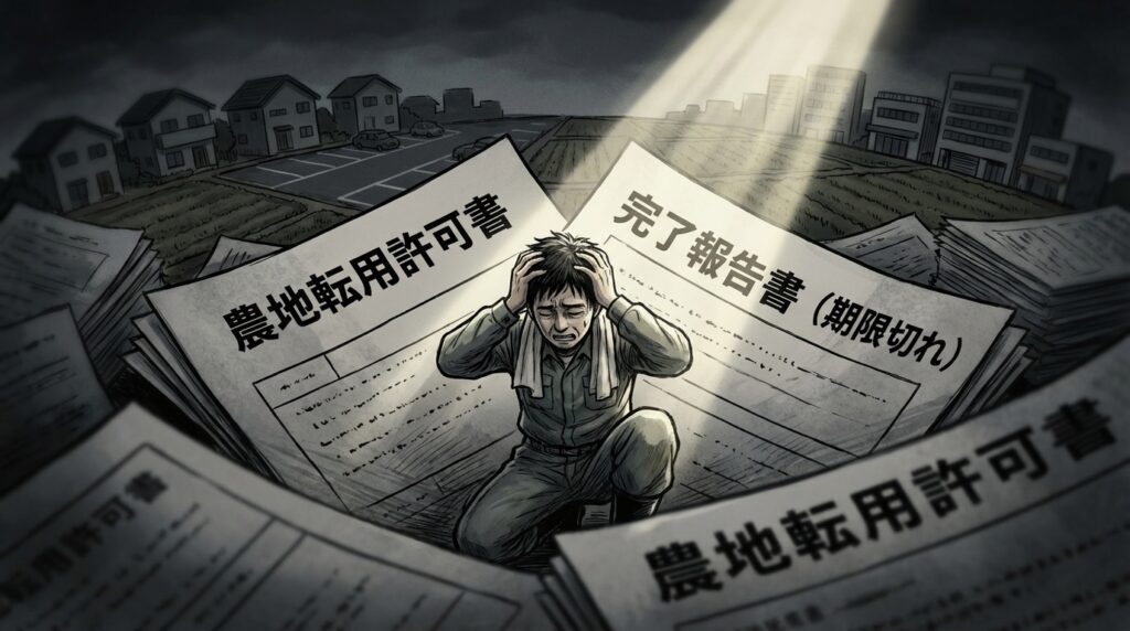 農地転用の許可が無事に下りて一安心。しかし、本当に大切なのはここからです。許可後に義務付けられている「工事完了報告書(以下、完了報告)」の提出を忘れてしまうと、予期せぬ事態に発展する可能性があります。